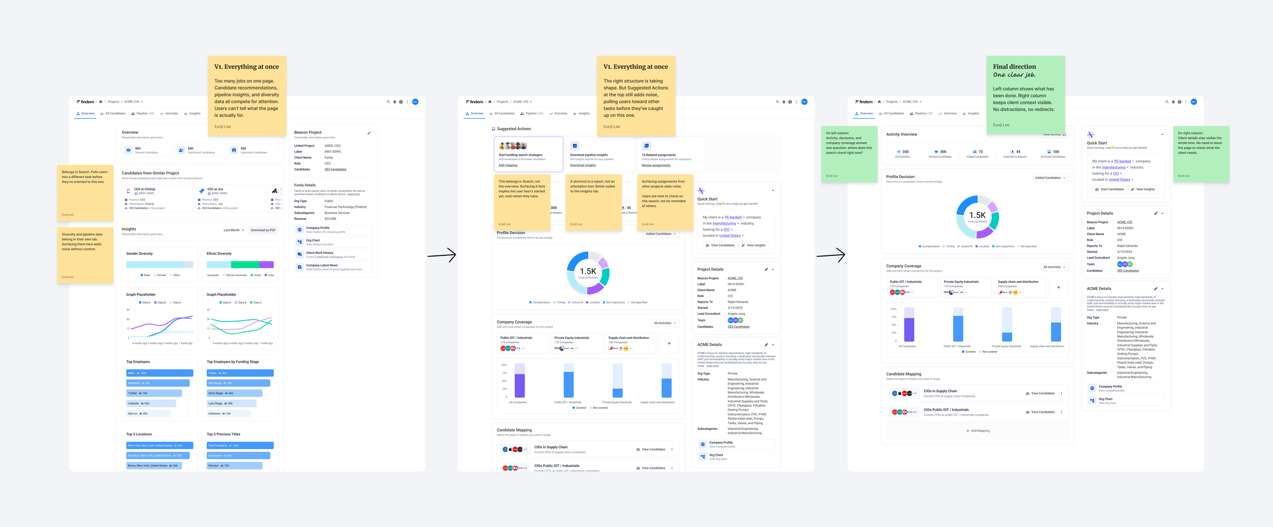 We stayed close to researchers from discovery to launch. Our primary users are researchers who source and assess people, manage pipelines, and track progress for clients. Early research helped us understand where their workflows break down and what they needed to work more effectively.